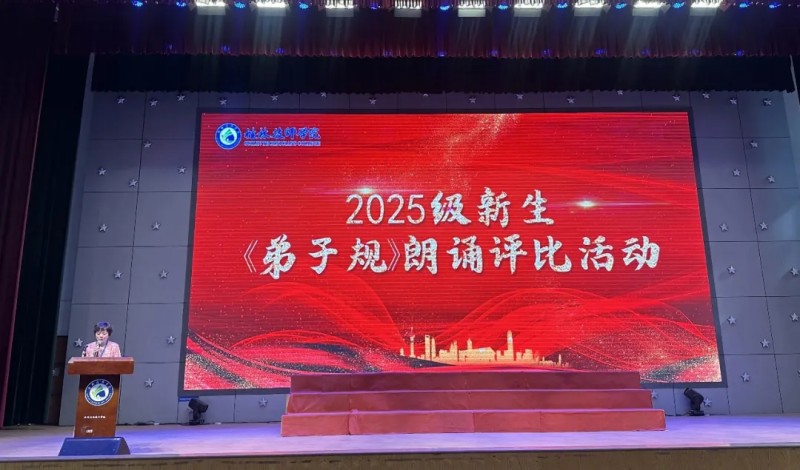 《弟子规》是学院在新生教育周精心开设的特色课程,以经典为载体,助力新生在传统文化浸润中开启校园新生活。自活动启动以来,语文教师及2025级全体班主任携手承担教学工作,各班级积极筹备,校园内迅速掀起学经典、诵经典的热潮。比赛现场,29支班级队伍依次登场,大多数班级以文本朗诵为核心形式,将《弟子规》的经典语句与真挚情感相融合。选手们身着整齐服装,精神饱满地站在舞台上,或抑扬顿挫、声情并茂,用铿锵语调传递“泛爱众,而亲仁”的处世之道;或温情脉脉、娓娓道来,以轻柔声音诠释“父母呼,应勿缓”的孝亲之情。