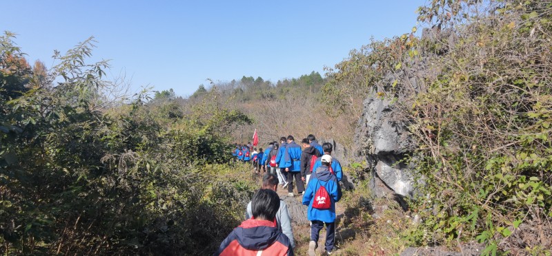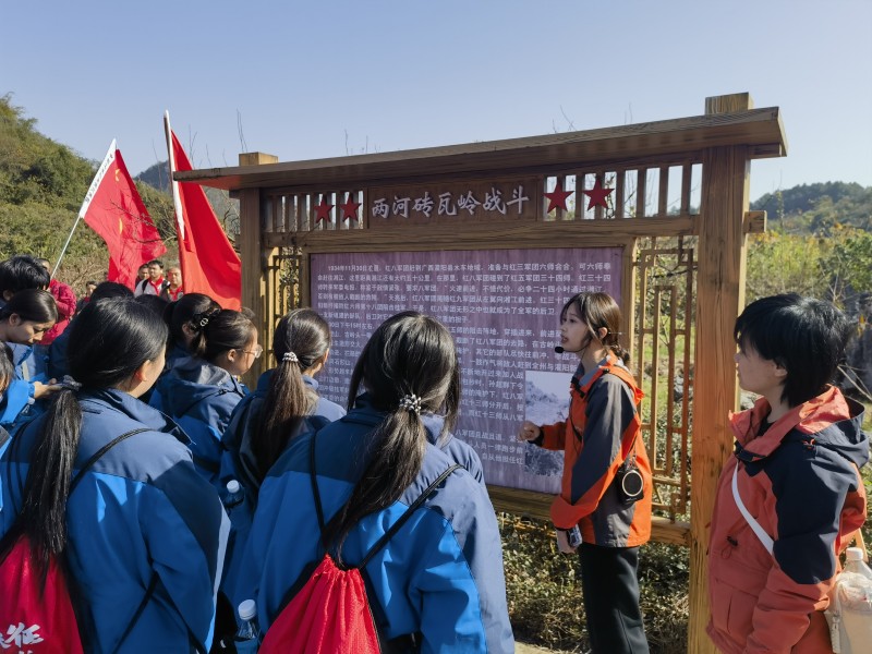上午9时,研学队伍从两河镇鲁水村长征驿站出发,踏上4公里蜿蜒崎岖的湘桂古道。这条曾见证红军浴血奋战的山路,如今成为青年学子“重走长征路”的实践课堂——石阶斑驳、草木葱茏,每一步都似与91年前的先烈对话。行至桃李园路段,《映山红》《七律·长征》等经典红歌骤然响起,歌声回荡山谷,红色记忆在行走中鲜活升温。